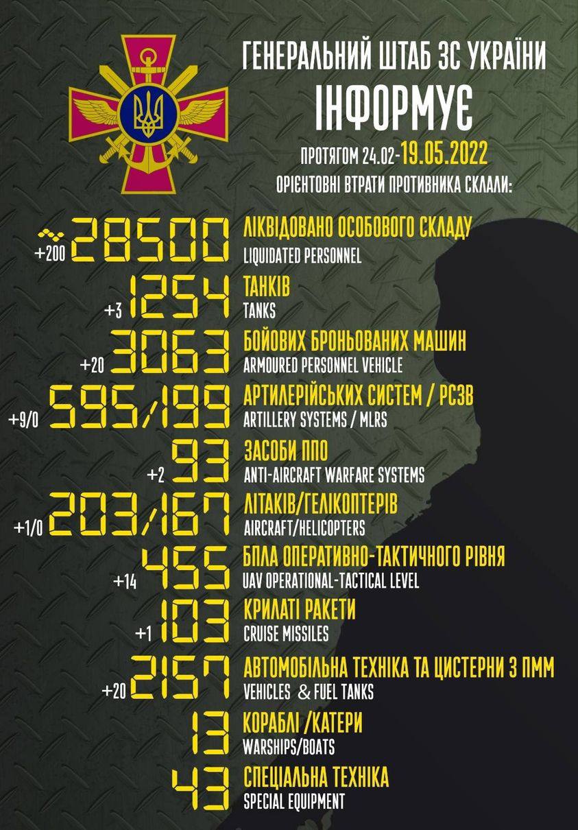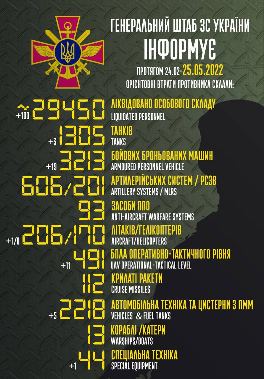 2022.05.25 - Війна триває. Усі намагання України залучити світ до боротьби з агресором залишаються не почутими. Майже не почутими. Так, велика подяка за військову і гуманітарну допомогу, підтримку урядів і звичайних людей, але цього, як виявляється, недостатньо. Санкції не працюють, бо залишаються розмитими і майже не дошкуляють ворогові. Постачання озброєння гальмується і недостатньо по кількості і якості, повітряний простір залишається не закритим, Swift не відключений, морські шляхи не деблоковані, мільярди за нафту та газ раша продовжує отримувати регулярно... Що заважає хоча б арештувати російські танкери з нафтою та кораблі з краденим зерном, замість того, щоб радіти тому, що на них не знайшовся покупець. Більшість демократичних країн підтримує нас у боротьбі, але залишається велика частка людства, що підтримує агресора (хто відкрито співпрацює, хто прикривається нейтралітетом, хто просто заплющує очі на всі ці звірства). Україна сильна, вона переможе! Питання у кількості людських жертв.