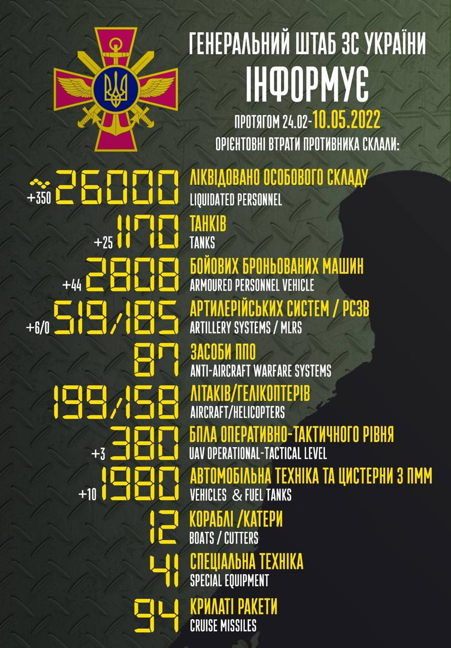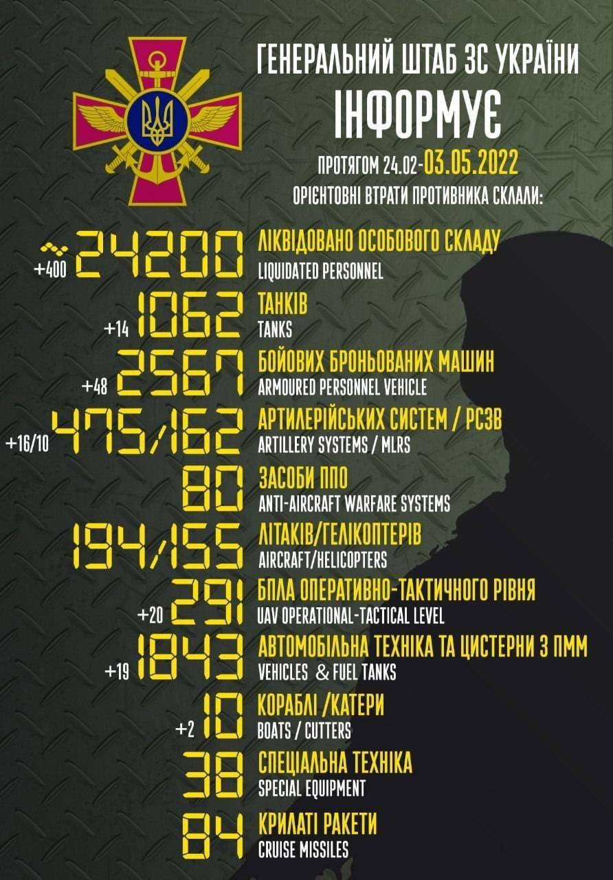 2022.05.03 - Залишається інтрига - що можна очікувати від рашистів на дев'яте травня (сакральна для них дата - свято перемоги)? Оголосять перемогу у вигляді звільнення Луганської та Донецької областей? Оголосять війну до повної перемоги та загальну мобілізацію з цього приводу? Натиснуть ядерну кнопку? Більш за все ми бажаємо, щоб путін здох, а раша капітулювала і розвалилась до цієї дати. Цього чекаємо, у цьому впевнені і це обов'язково станеться! Україна переможе!